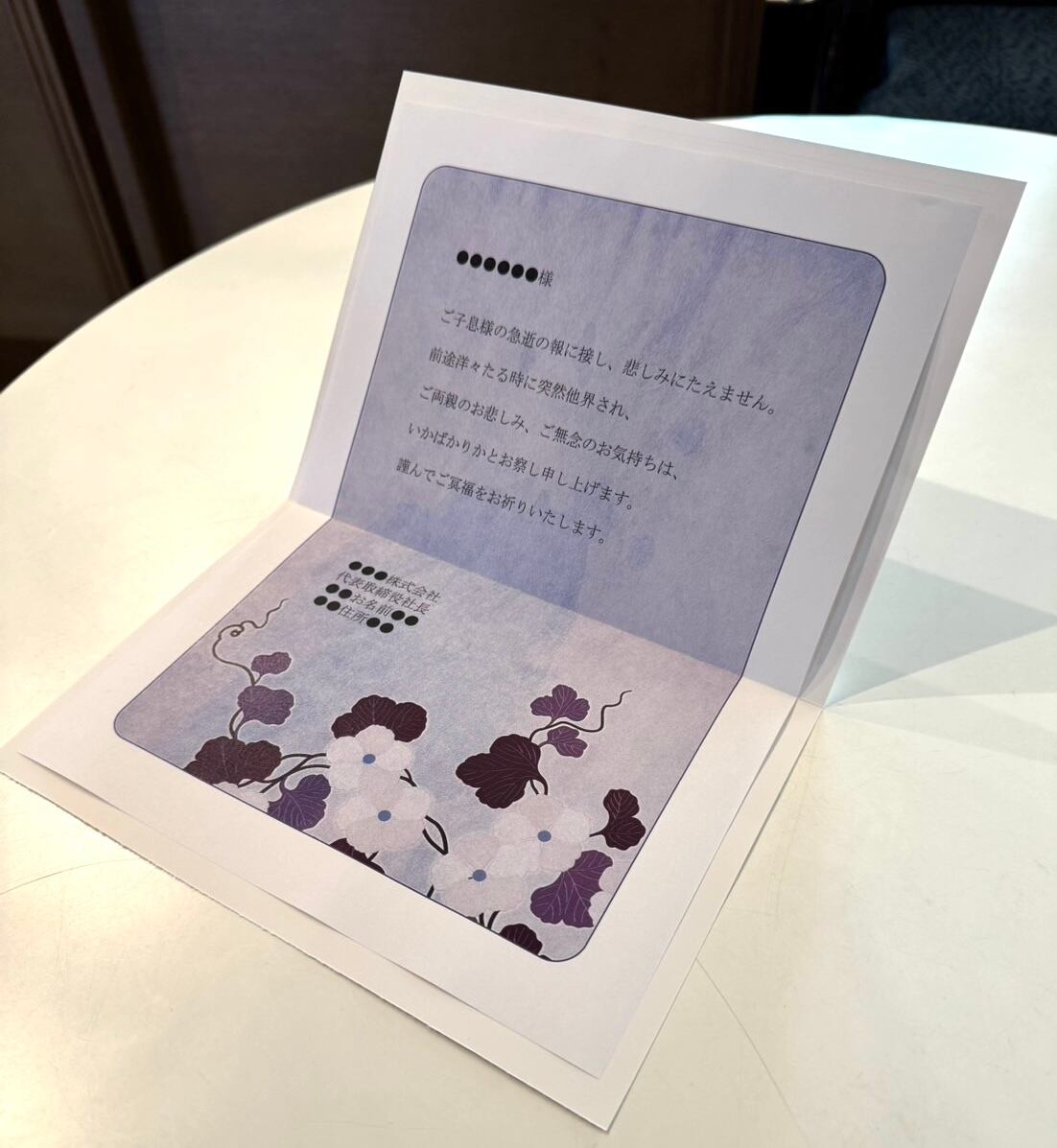 お申し込みいただいた弔文を台紙に印刷して原田斎場及び翔庵にお届けします。